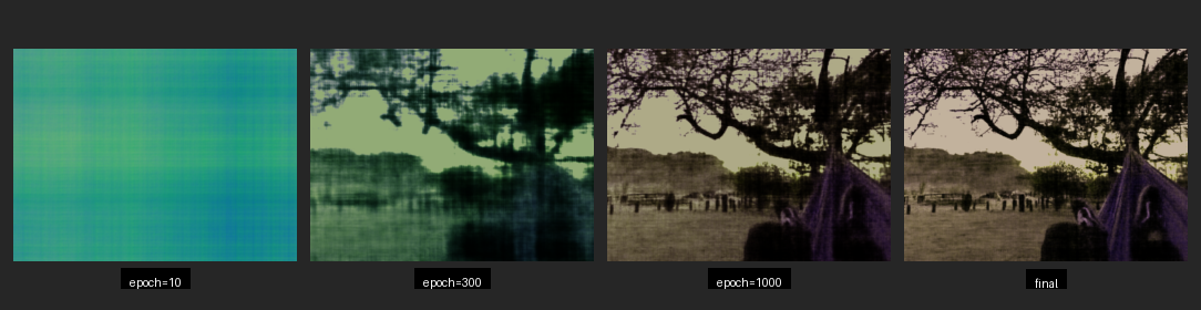 Let's look at the comparison between hyperparameters. It's immediately visible that a greater positional encoding - L - gives a much greater impact on image quality than an increase in layer width - W. Actually, I found increasing W to be often very frustrating. Not only did the model take much longer to train, it often got caught in a local optimum for colors and I frequently had to retrain it. The L4_W512 was especially susceptible to this as you can see even in the best training on the hammock image I had.